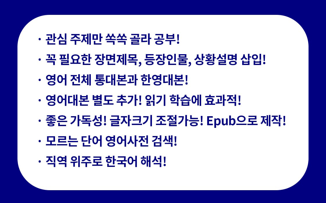 • 관심 주제만 쏙쏙 골라 공부! • 꼭 필요한 장면제목, 등장인물, 상황설명 삽입! • 영어 전체 통대본과 한영대본! • 영어대본 별도 추가! 읽기 학습에 효과적! • 좋은 가독성! 글자크기 조절가능! Epub으로 제작! • 모르는 단어 영어사전 검색! • 직역 위주로 한국어 해석!
