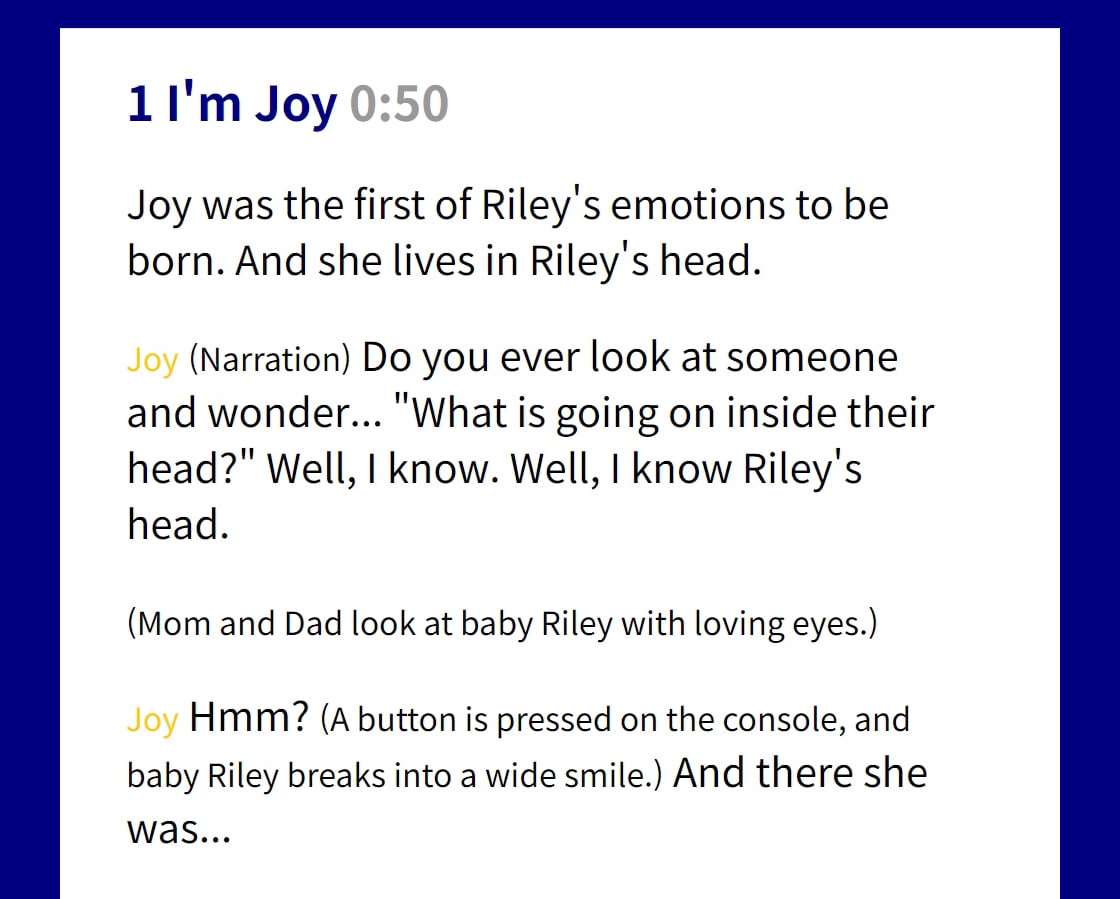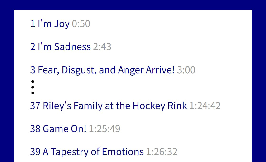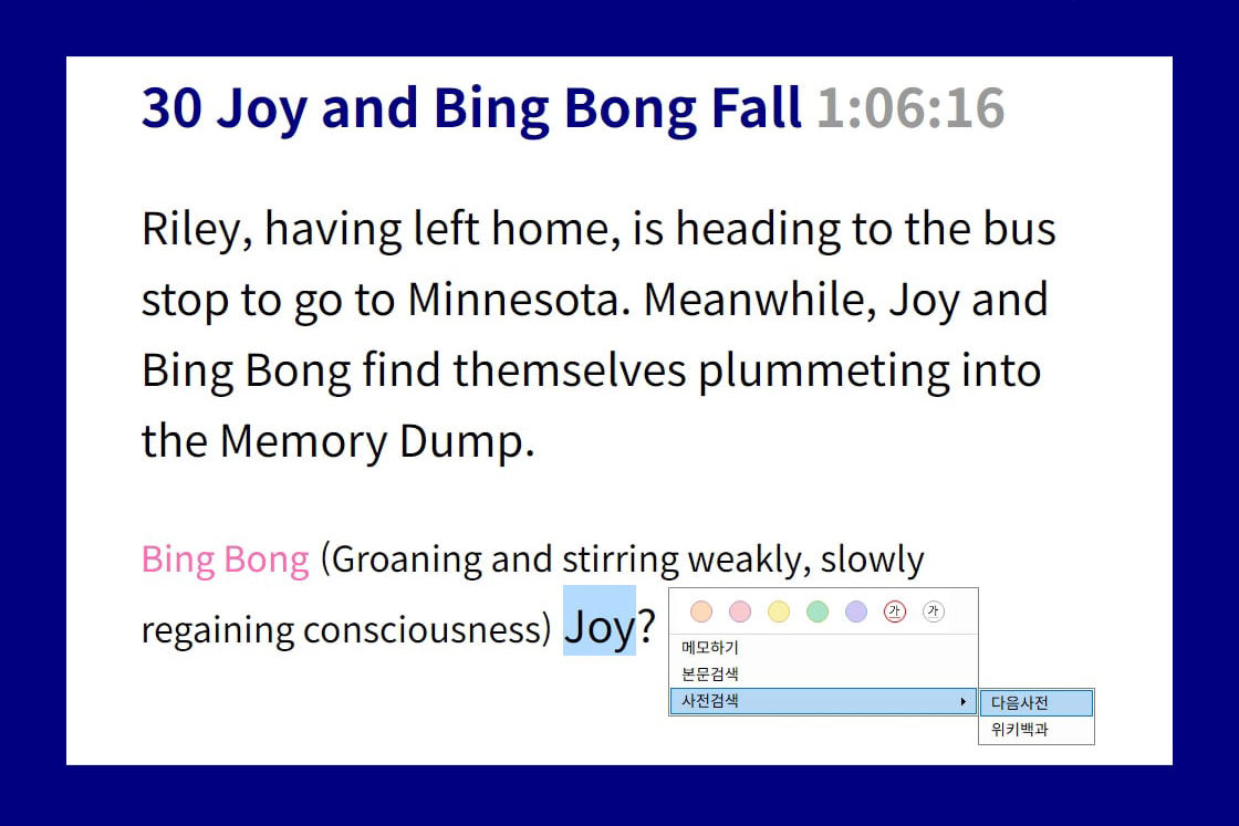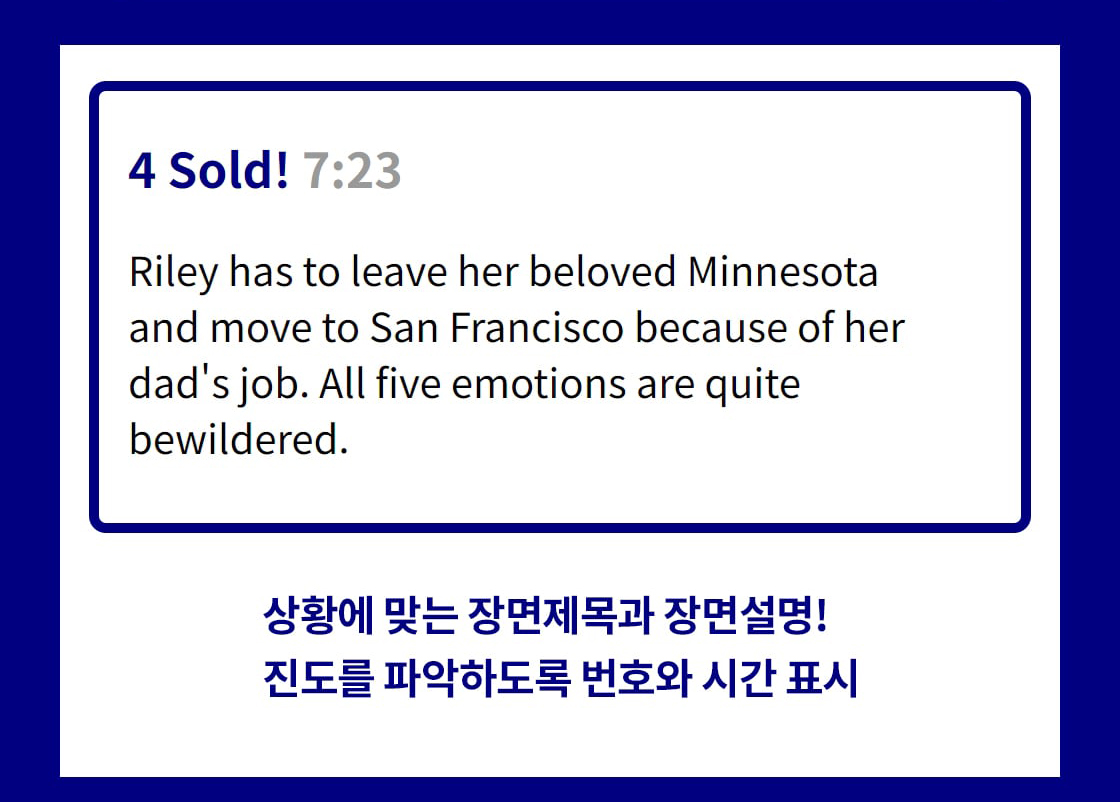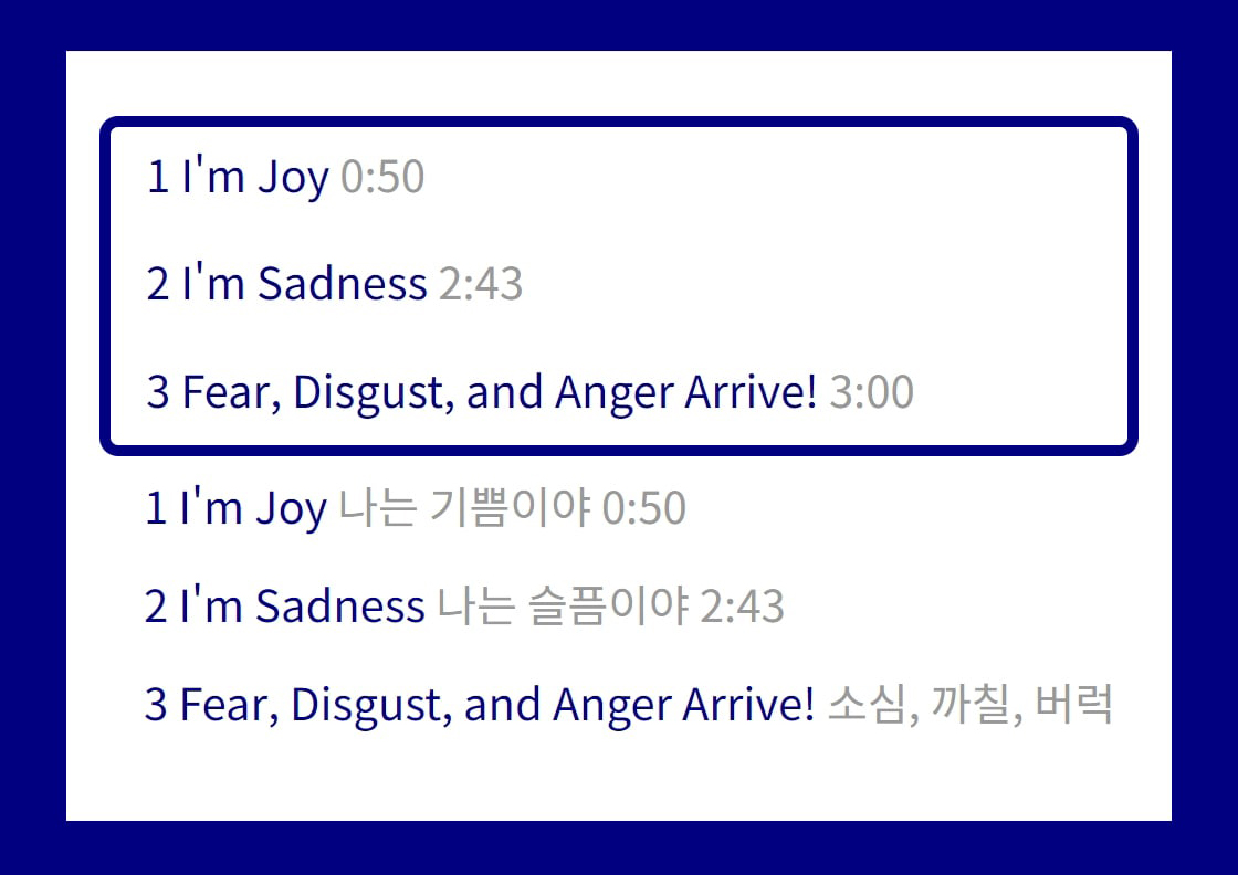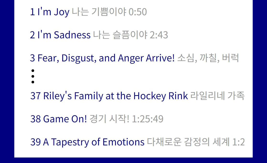 일러두기 1 I’m Joy0:50 2 I’m Sadness2:43 3 Fear, Disgust, and Anger Arrive!3:00 4 Sold!7:23 5 New House, Dead Mouse8:40 6 Broccoli Pizza Nightmare11:15 7 Riley on the Stairs13:02 8 Riley’s Bedtime15:46 9 Wow! Dream Productions!18:27 10 Riley’s Breakfast20:00 11 First Day of School22:00 12 Joy and Sadness Lost in Long Term Memory25:21 13 Family Dinner with Riley26:46 14 Riley’s Room / Long Term Memory30:44 15 Meeting the Mind Workers!34:40 16 Video Chat with Best Friend Meg36:02 17 Meeting Bing Bong37:32 18 Shortcut to the station41:52 19 Joy, Sadness, and Bing Bong in Imagination Land43:53 20 Riley and Mom at the Hockey Rink45:19 21 All Aboard the Train of Thought!46:51 22 Riley in her room50:02 23 Welcome to Dream Productions!51:33 24 Entering the Classroom Set52:37 25 Run from Jangles!56:37 26 Riley Opens Her Laptop1:00:04 27 On the Train of Thought1:01:17 28 Night in the Living Room1:02:34 29 Riley Runs Away1:04:04 30 Joy and Bing Bong Fall1:06:16 31 Mom and Dad’s Return1:13:40 32 For Riley!1:16:35 33 Back to Headquarters1:18:06 34 Riley on the Bus1:18:53 35 Riley Returns1:20:00 36 New Expanded Console1:23:57 37 Riley’s Family at the Hockey Rink1:24:42 38 Game On!1:25:49 39 A Tapestry of Emotions1:26:32 1 I’m Joy나는 기쁨이야 0:50 2 I’m Sadness나는 슬픔이야 2:43 3 Fear, Disgust, and Anger Arrive!소심, 까칠, 버럭 등장! 3:00 4 Sold!집 팔렸음! 7:23 5 New House, Dead Mouse새 집, 죽은 쥐 8:40 6 Broccoli Pizza Nightmare브로콜리 피자 악몽 11:15 7 Riley on the Stairs계단 위의 라일리 13:02 8 Riley’s Bedtime라일리, 꿈나라로 15:46 9 Wow! Dream Productions!와! 꿈 제작소다! 18:27 10 Riley’s Breakfast아침을 먹는 라일리 20:00 11 First Day of School새 학교 첫날 22:00 12 Joy and Sadness Lost in Long Term Memory장기 기억 저장소에 갇힌 기쁨과 슬픔 25:21 13 Family Dinner with Riley라일리네 가족 식사 26:46 14 Riley’s Room / Long Term Memory라일리의 방 / 장기 기억 저장소 30:44 15 Meeting the Mind Workers!기억 처리반을 만나다! 34:40 16 Video Chat with Best Friend Meg절친 멕과 화상 통화 36:02 17 Meeting Bing Bong빙봉과의 만남 37:32 18 Shortcut to the station기차역으로 가는 지름길 41:52 19 Joy, Sadness, and Bing Bong in Imagination Land상상의 나라에 온 기쁨, 슬픔, 빙봉 43:53 20 Riley and Mom at the Hockey Rink라일리와 엄마, 하키장에 가다 45:19 21 All Aboard the Train of Thought!모두 생각 기차에 탑승하세요! 46:51 22 Riley in her room라일리의 방 50:02 23 Welcome to Dream Productions!꿈 제작소에 온 걸 환영해! 51:33 24 Entering the Classroom Set교실 세트장에 입장 52:37 25 Run from Jangles!피에로 풍선이다! 도망쳐! 56:37 26 Riley Opens Her Laptop라일리, 노트북을 켜다 1:00:04 27 On the Train of Thought생각 기차 안에서 1:01:17 28 Night in the Living Room밤의 거실 1:02:34 29 Riley Runs Away라일리의 가출 1:04:04 30 Joy and Bing Bong Fall기쁨과 빙봉, 떨어지다 1:06:16 31 Mom and Dad’s Return엄마 아빠가 돌아왔다 1:13:40 32 For Riley!라일리를 위해! 1:16:35 33 Back to Headquarters본부 복귀 1:18:06 34 Riley on the Bus버스 탄 라일리 1:18:53 35 Riley Returns라일리, 다시 집으로 1:20:00 36 New Expanded Console더욱 강력해진 제어판 1:23:57 37 Riley’s Family at the Hockey Rink라일리네 가족, 하키장에 가다 1:24:42 38 Game On!경기 시작! 1:25:49 39 A Tapestry of Emotions다채로운 감정의 세계 1:26:32 판권