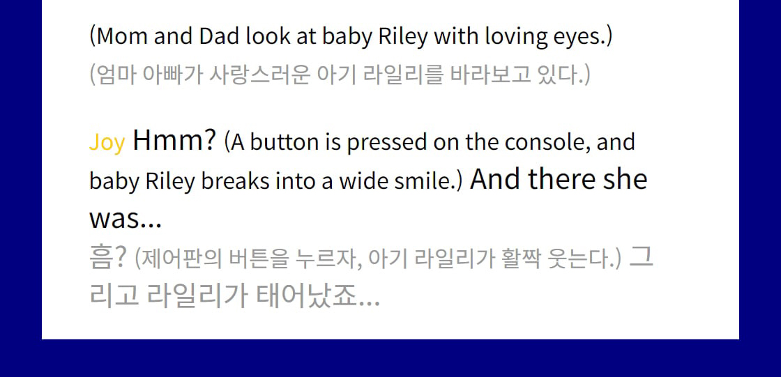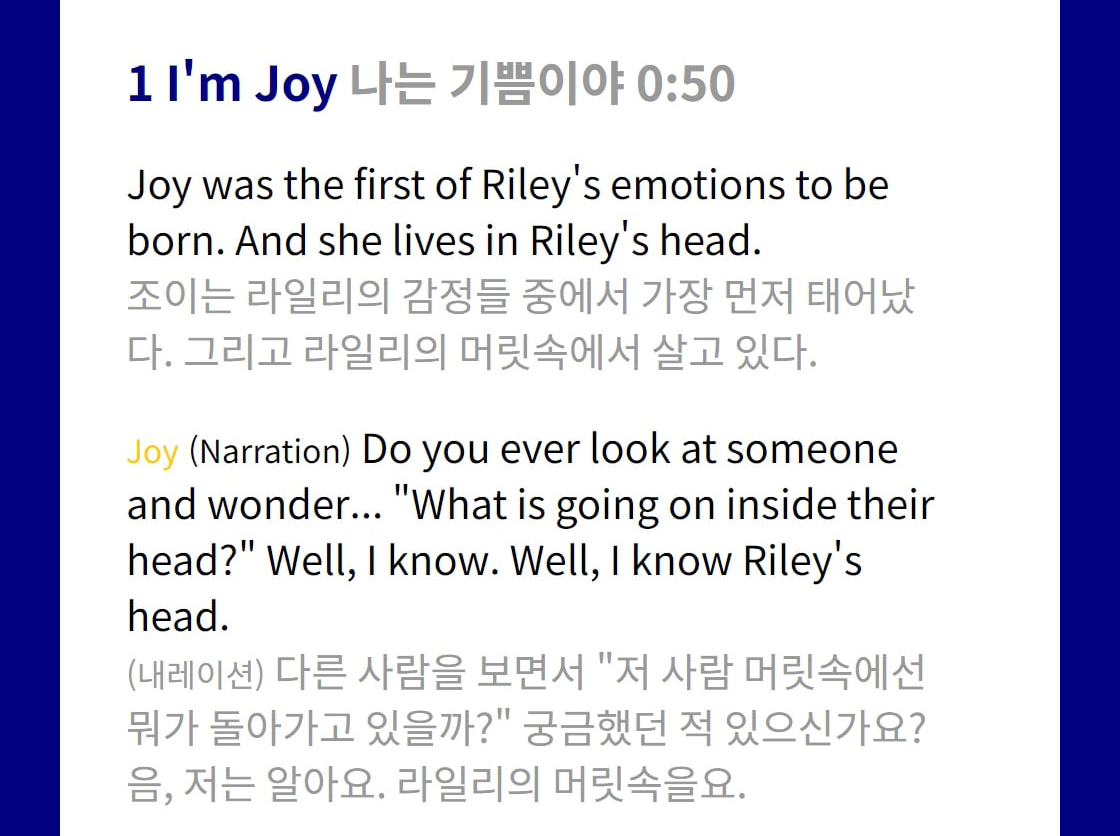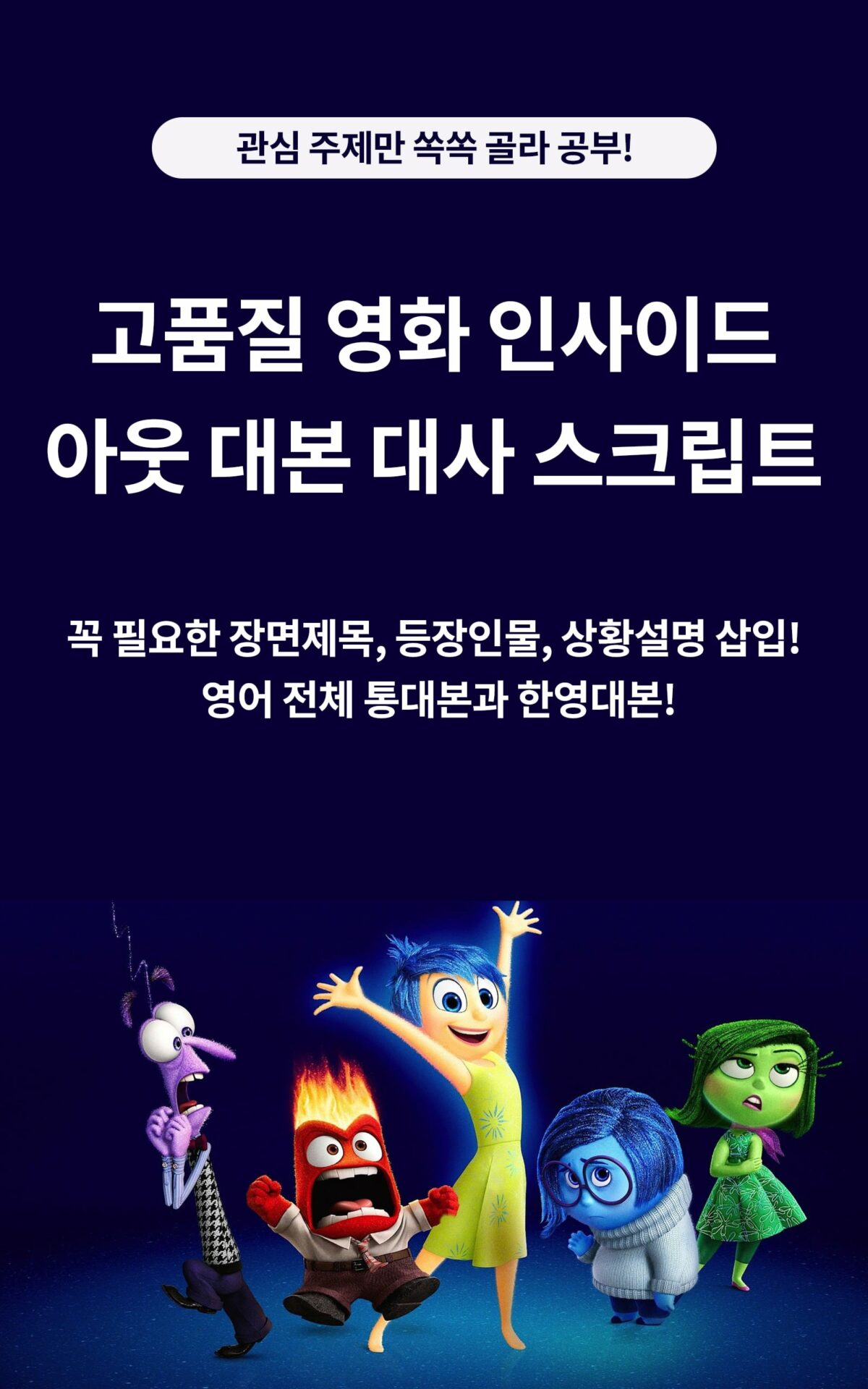 • 난이도 : 초중급 ★★★☆☆ • 정 가 : 전자책 19,500원 • ISBN : 979-11-94173-22-9 • 출 간 : 2025년 1월 22일 • 원작자 : Pete Docter • 한국어 책 제목 : 고품질 영화 인사이드 아웃 대본 대사 스크립트 • 영어 책 제목 : Inside Out Script