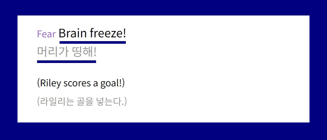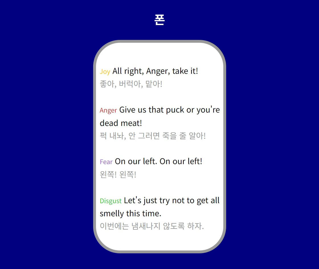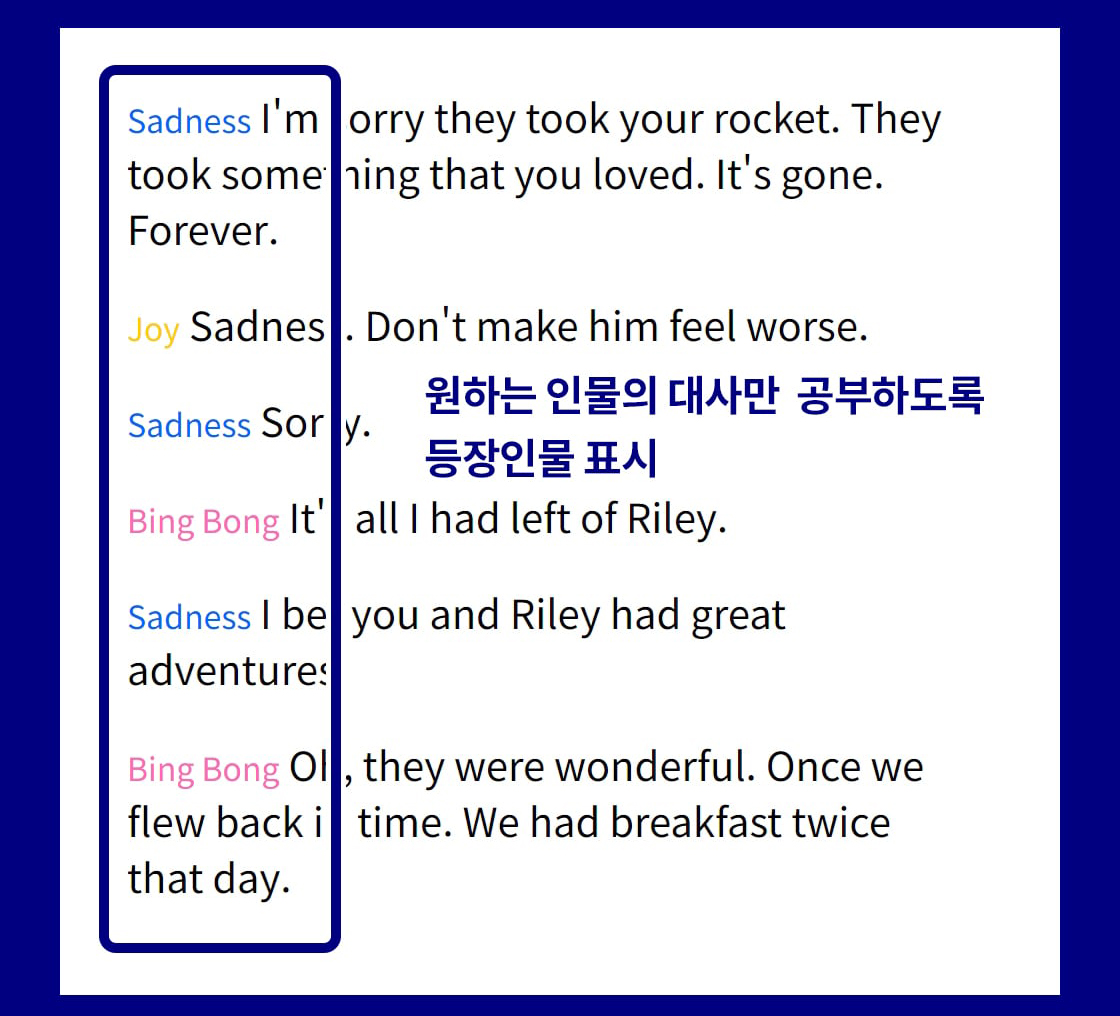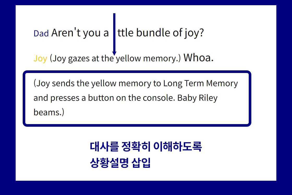 • 난이도 : 초중급 ★★★☆☆ • 정 가 : 전자책 19,500원 • ISBN : 979-11-94173-22-9 • 출 간 : 2025년 1월 22일 • 원작자 : Pete Docter • 한국어 책 제목 : 고품질 영화 인사이드 아웃 대본 대사 스크립트 • 영어 책 제목 : Inside Out Script