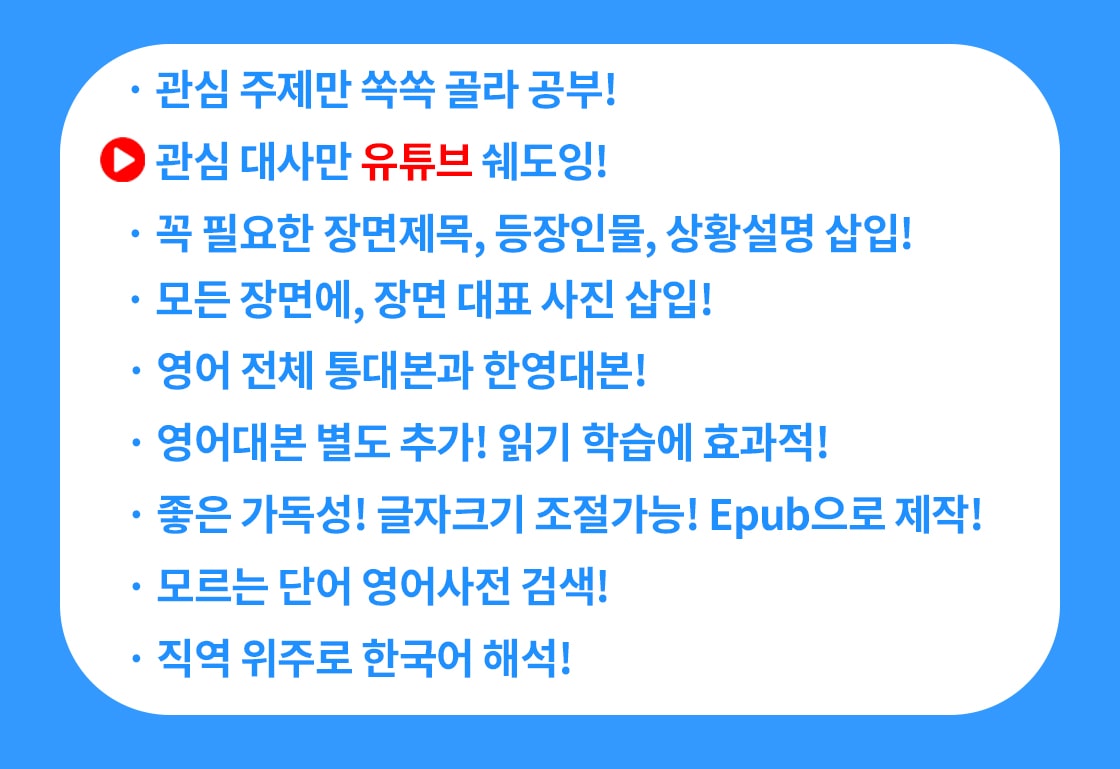• 관심 주제만 쏙쏙 골라 공부! 관심 대사만 유튜브 쉐도잉! • 꼭 필요한 장면제목, 등장인물, 상황설명 삽입! • 모든 장면에, 장면 대표 사진 삽입! • 영어 전체 통대본과 한영대본! • 영어대본 별도 추가! 읽기 학습에 효과적! • 좋은 가독성! 글자크기 조절가능! Epub으로 제작! • 모르는 단어 영어사전 검색! • 직역 위주로 한국어 해석!
