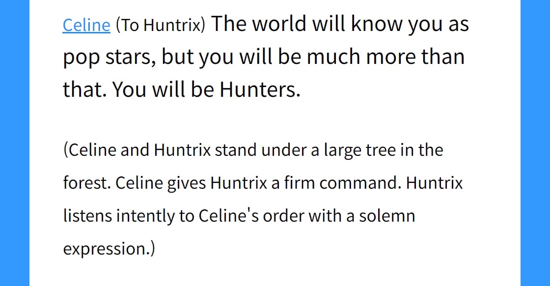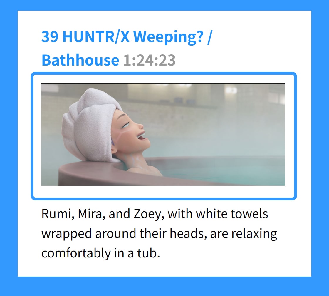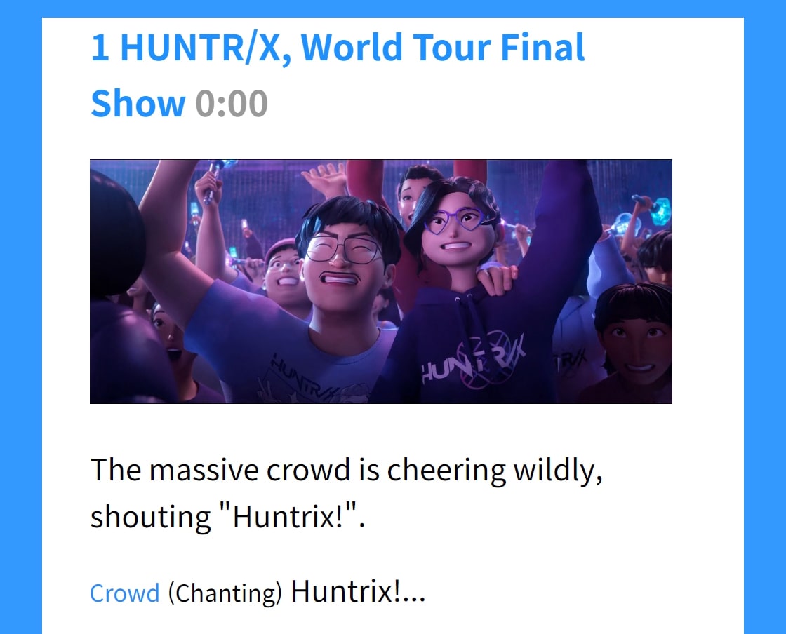 일러두기 1 HUNTR/X, World Tour Final Show 0:00 2 Devouring Gimbap and Ramyeon / Airplane 3:33 3 Battle with Demons / Airplane 4:56 4 Jinu’s Secret Deal with Gwi-Ma 8:40 5 Couch! Couch! Couch! / Backstage 11:25 6 Let’s Go Promo! / Couch 12:37 7 New Single “Golden” 13:48 8 Rumi’s Sore Throat 15:25 9 Rumi’s Demon Patterns 17:00 10 Mira and Zoey Comfort Rumi / Seolleongtang Restaurant 19:30 11 Who Are the Saja Boys? / Street 21:17 12 We Got The Tonics! / Korean Medicine Clinic 21:30 13 HUNTR/X’s First Meeting with the Saja Boys 24:00 14 SPICY CHALLENGE!! 29:15 15 HUNTR/X Rides a Slide! 29:53 16 HUNTR/X Battles the Saja Boys / Bathhouse 31:00 17 Jinu’s Second Meeting with Gwi-Ma 33:22 18 HUNTR/X’s Fighting Spirit Ignites / Penthouse 34:25 19 Jinu’s Note / Rumi’s Room 36:14 20 Jinu Confesses His Past to Rumi 38:16 21 HUNTR/X Creates the Song “Takedown” / Studio 41:55 22 HUNTR/X vs. Saja Boys / Fan Event 44:06 23 Rumi and Mira’s Conflict / Penthouse 46:42 24 The Saja Boys Absorb Souls 48:50 25 Rumi Asks Jinu for Help 49:20 26 Rumi Refuses to Sing / Rehearsal 51:52 27 Rumi’s Conflict with Mira and Zoey / Subway 53:18 28 Rumi and Jinu Join Hands / Hanok Village 55:23 29 Gwi-Ma Threatens Jinu 59:45 30 HUNTR/X Opens Up / Penthouse 1:01:00 31 International Idol Awards Opening 1:03:05 32 Rumi’s Demon Patterns Revealed! 1:06:20 33 Rumi Confronts Mira and Zoey 1:07:55 34 Jinu Deceives Rumi 1:09:26 35 People Head to Namsan Tower! 1:10:57 36 Rumi Meets Celine, But… / Forest 1:12:26 37 A World of Demons! People Lose Their Minds… 1:14:57 38 HUNTR/X Defeats the Gwi-Ma! 1:17:32 39 HUNTR/X Weeping? / Bathhouse 1:24:23 40 HUNTR/X’s 3v3 Fan Meeting 1:24:55