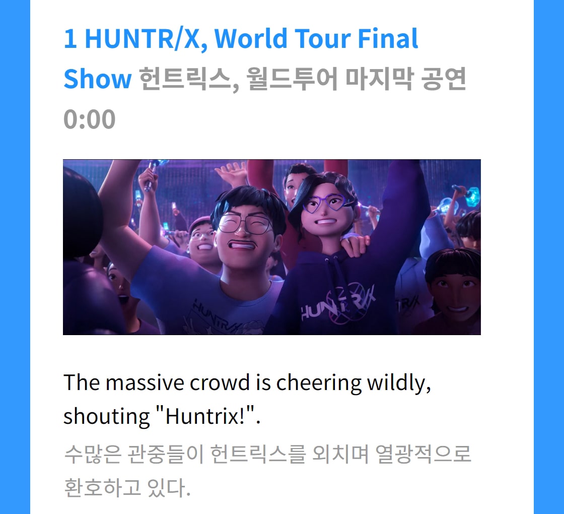 1 HUNTR/X, World Tour Final Show헌트릭스, 월드투어 마지막 공연 0:00 2 Devouring Gimbap and Ramyeon / Airplane김밥, 라면 폭풍 흡입 / 비행기 3:33 3 Battle with Demons / Airplane악귀와의 전투 / 비행기 4:56 4 Jinu’s Secret Deal with Gwi-Ma진우, 귀마와 은밀한 거래 8:40 5 Couch! Couch! Couch! / Backstage소파! 소파! 소파! / 무대 뒤 11:25 6 Let’s Go Promo! / Couch홍보하러 가자! / 소파 12:37 7 New Single “Golden”신곡 “Golden” 13:48 8 Rumi’s Sore Throat루미, 목 아픔 15:25 9 Rumi’s Demon Patterns루미, 악귀 문양 17:00 10 Mira and Zoey Comfort Rumi / Seolleongtang Restaurant미라와 조이, 루미 위로 / 설렁탕 식당 19:30 11 Who Are the Saja Boys? / Street사자 보이즈가 누구? / 길 21:17 12 We Got The Tonics! / Korean Medicine Clinic약 받았다! / 한의원 21:30 13 HUNTR/X’s First Meeting with the Saja Boys헌트릭스, 사자 보이즈와 첫 만남 24:00 14 SPICY CHALLENGE!!매운맛 챌린지!! 29:15 15 HUNTR/X Rides a Slide!헌트릭스, 미끄럼틀 타다! 29:53 16 HUNTR/X Battles the Saja Boys / Bathhouse헌트릭스, 사자 보이즈와 전투 / 목욕탕 31:00 17 Jinu’s Second Meeting with Gwi-Ma진우, 귀마와 두 번째 만남 33:22 18 HUNTR/X’s Fighting Spirit Ignites / Penthouse헌트릭스, 전의를 불태우다 / 펜트하우스 34:25 19 Jinu’s Note / Rumi’s Room진우의 쪽지 / 루미의 방 36:14 20 Jinu Confesses His Past to Rumi진우, 루미에게 과거를 털어놓다 38:16 21 HUNTR/X Creates the Song “Takedown” / Studio헌트릭스, Takedown 곡을 만들다 / 작업실 41:55 22 HUNTR/X vs. Saja Boys / Fan Event헌트릭스 대 사자 보이즈 / 팬 행사 44:06 23 Rumi and Mira’s Conflict / Penthouse루미와 미라의 갈등 / 펜트하우스 46:42 24 The Saja Boys Absorb Souls사자 보이즈, 영혼을 빨아들이다 48:50 25 Rumi Asks Jinu for Help루미, 진우에게 도움 요청 49:20 26 Rumi Refuses to Sing / Rehearsal루미, 노래 부르기 거부 / 리허설 51:52 27 Rumi’s Conflict with Mira and Zoey / Subway루미, 미라 조이와 갈등 / 지하철 53:18 28 Rumi and Jinu Join Hands / Hanok Village루미와 진우, 손을 잡다 / 한옥마을 55:23 29 Gwi-Ma Threatens Jinu귀마, 진우를 협박 59:45 30 HUNTR/X Opens Up / Penthouse헌트릭스, 속마음을 털어놓다 / 펜트하우스 1:01:00 31 International Idol Awards Opening국제 아이돌 시상식 개막 1:03:05 32 Rumi’s Demon Patterns Revealed!루미의 악귀 문양, 폭로되다! 1:06:20 33 Rumi Confronts Mira and Zoey루미, 미라 조이와 대결 1:07:55 34 Jinu Deceives Rumi진우, 루미를 속이다 1:09:26 35 People Head to Namsan Tower!사람들, 남산타워로! 1:10:57 36 Rumi Meets Celine, But… / Forest셀린을 만난 루미, 그러나… / 숲 1:12:26 37 A World of Demons! People Lose Their Minds…악귀들 세상! 초점 잃은 사람들… 1:14:57 38 HUNTR/X Defeats the Gwi-Ma!헌트릭스, 귀마를 무찌르다! 1:17:32 39 HUNTR/X Weeping? / Bathhouse통곡하는 헌트릭스? / 목욕탕 1:24:23 40 HUNTR/X’s 3v3 Fan Meeting헌트릭스, 3대3 팬미팅 1:24:55 판권