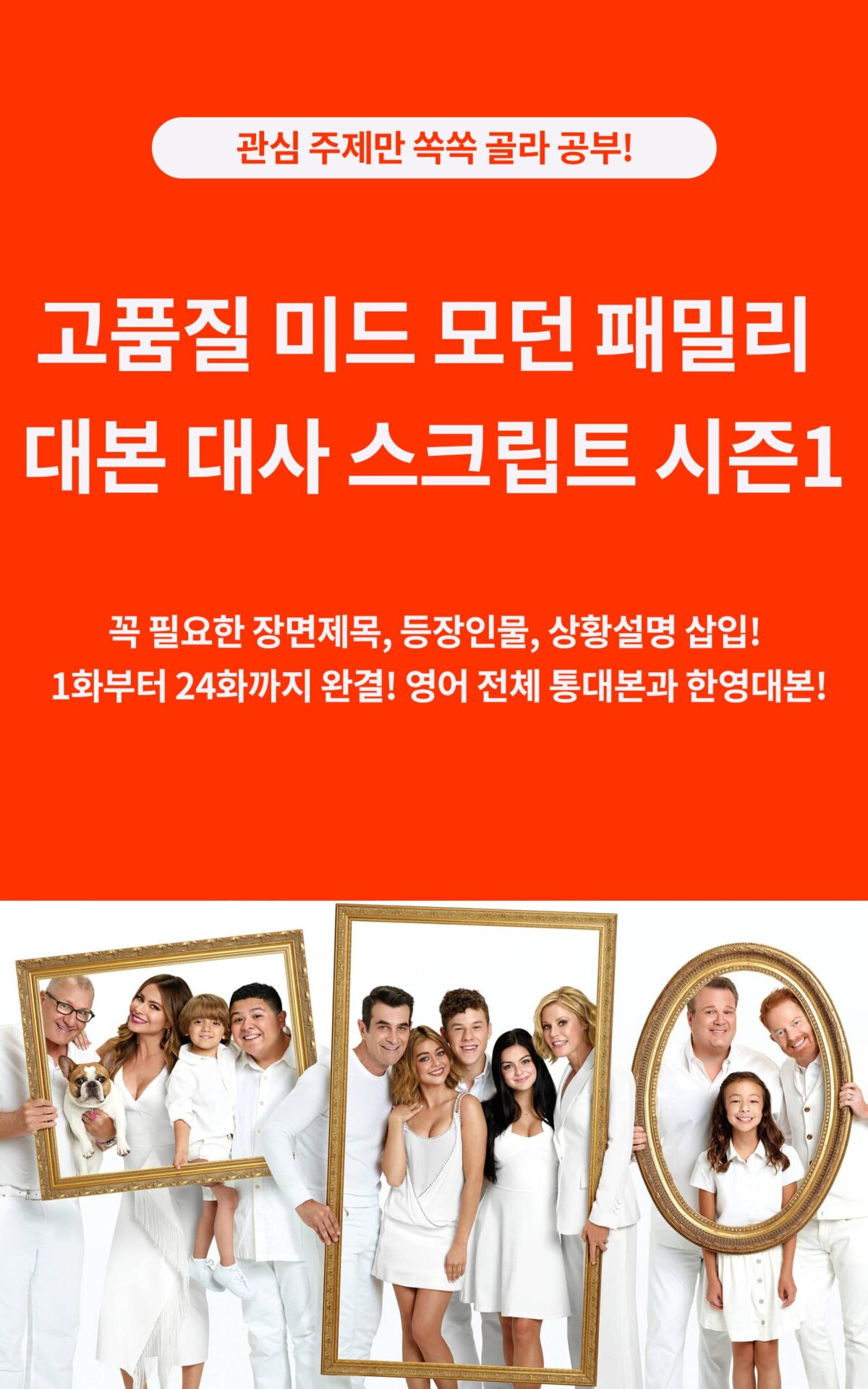 미드 모던 패밀리 시즌1 대본! 세 가족의 다양한 형태를 유머러스하고 따뜻하게 담아낸 인기 코미디 드라마의 시작! 다양한 연령대의 캐릭터가 등장해 여러 톤의 일상 대화와 가족 간의 표현을 풍부하게 익힐 수 있음.