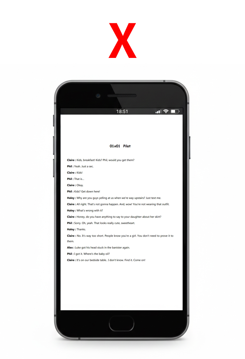 무료 대본은 오타와 오역이 많고, 장면이 나눠져 있지 않아 원하는 장면을 못 찾습니다. PDF라 폰에서 손가락으로 펼쳐 보느라 눈 아프죠? 이러면 눈 나빠져요.