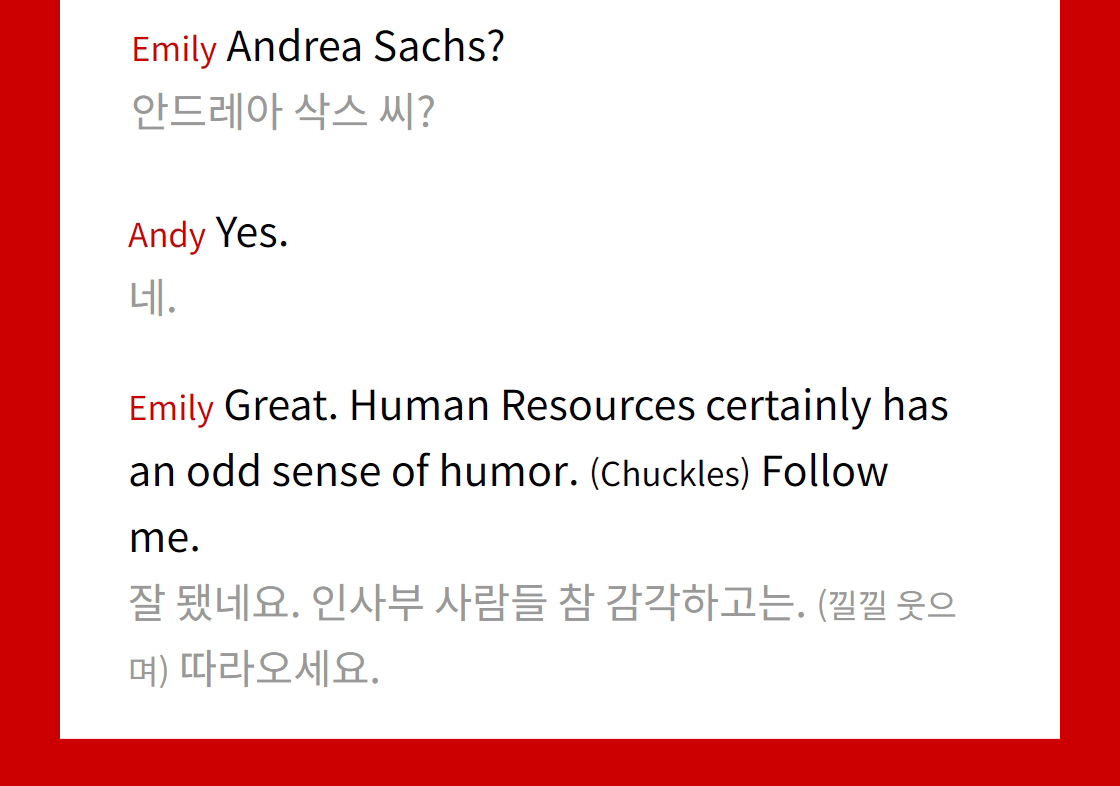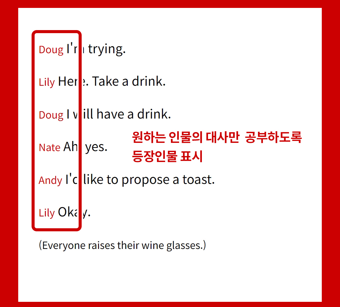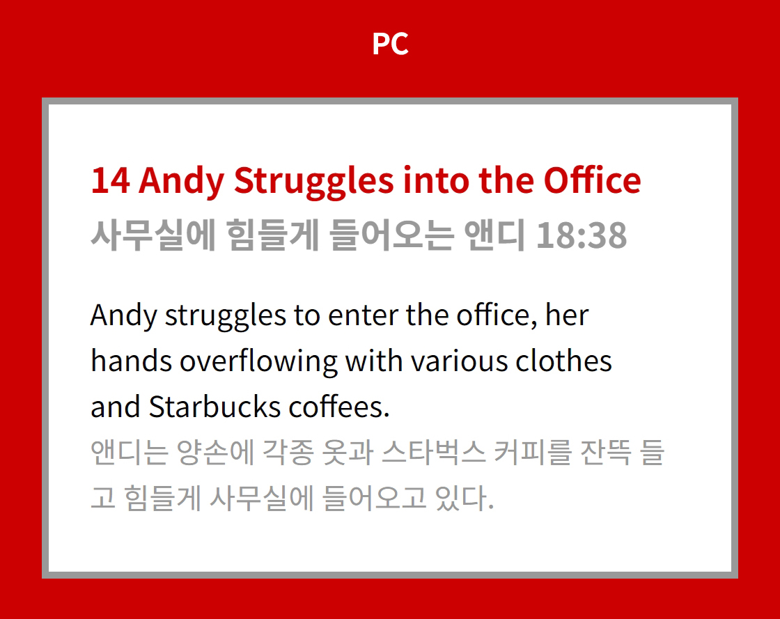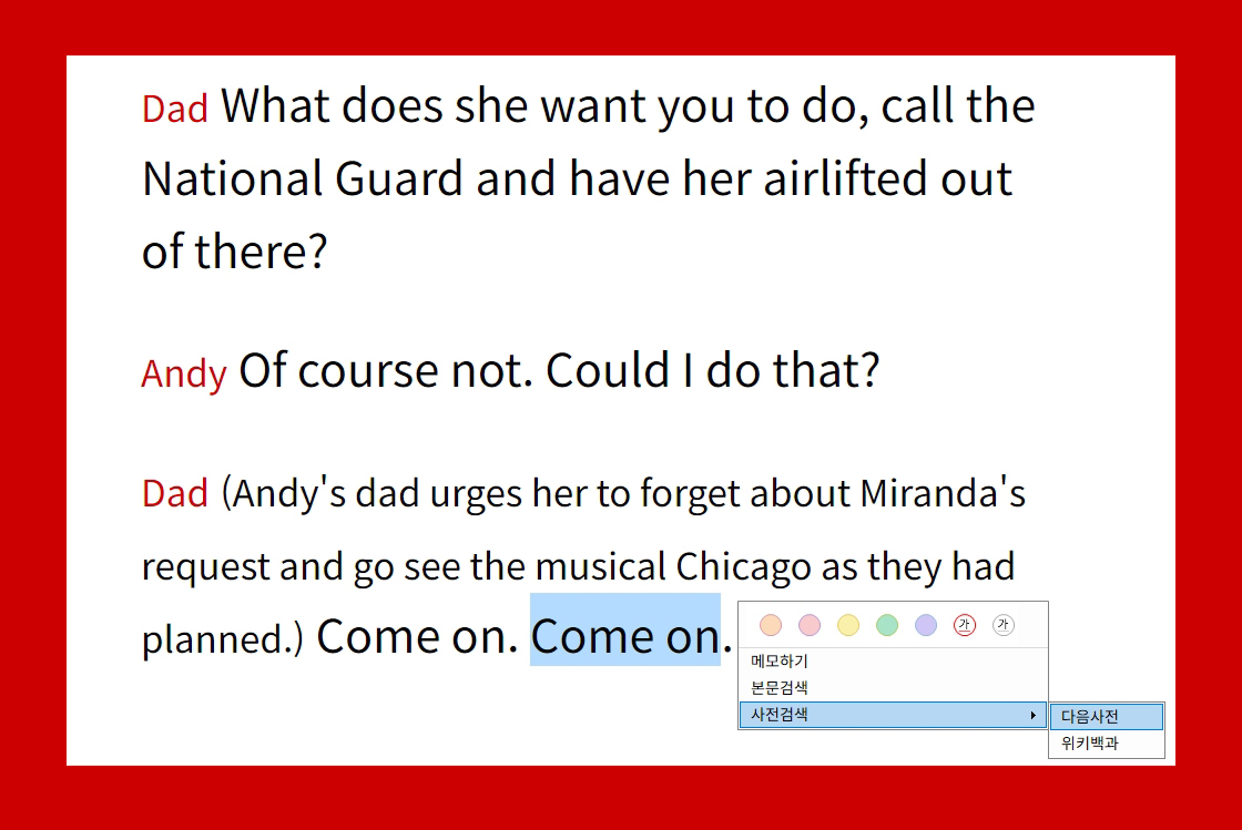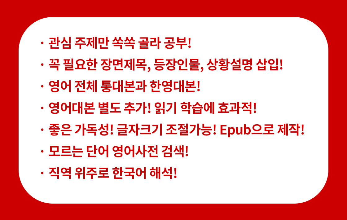 • 관심 주제만 쏙쏙 골라 공부! • 꼭 필요한 장면제목, 등장인물, 상황설명 삽입! • 영어 전체 통대본과 한영대본! • 영어대본 별도 추가! 읽기 학습에 효과적! • 좋은 가독성! 글자크기 조절가능! Epub으로 제작! • 모르는 단어 영어사전 검색! • 직역 위주로 한국어 해석!