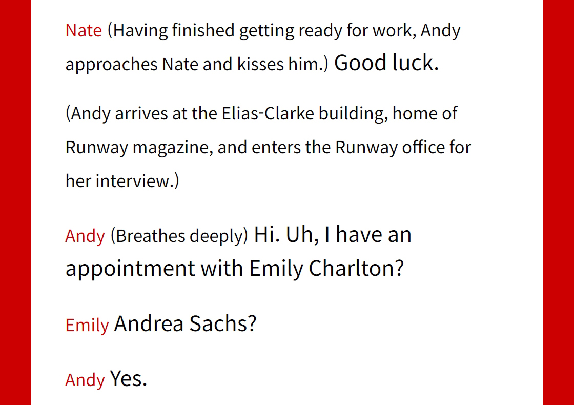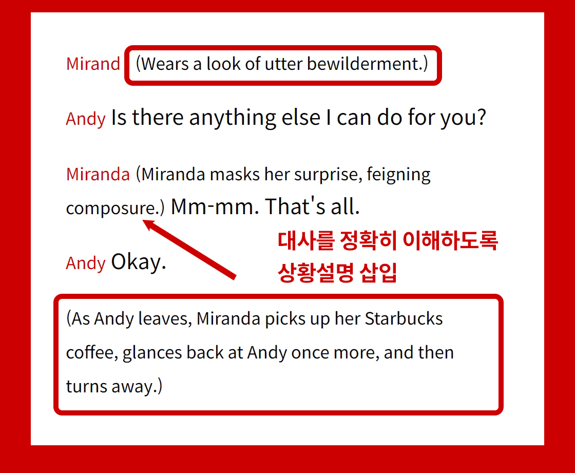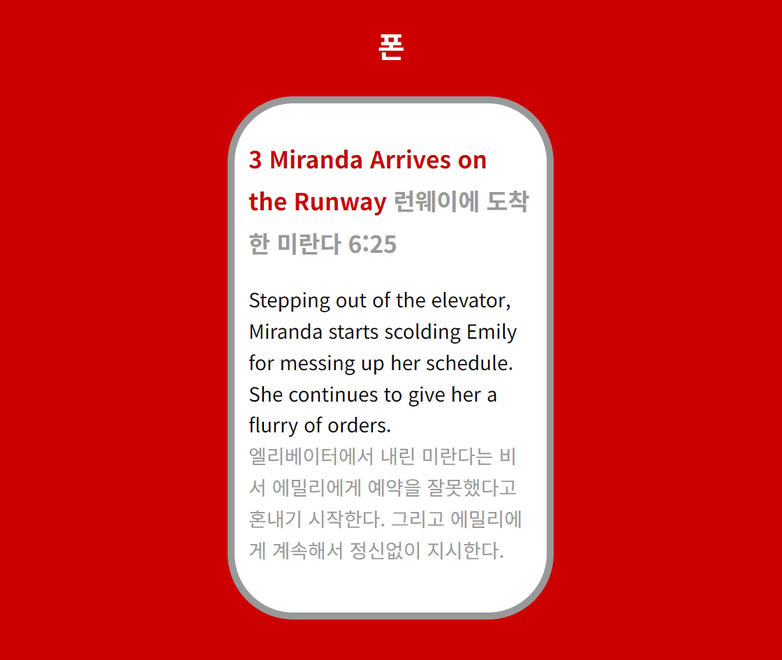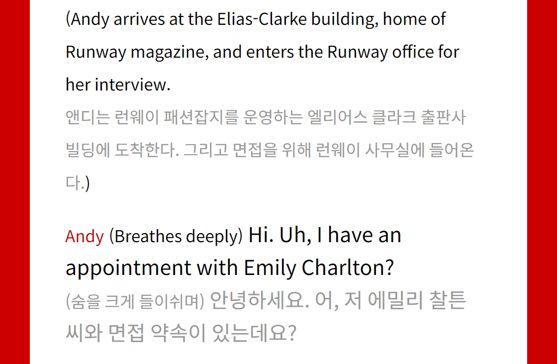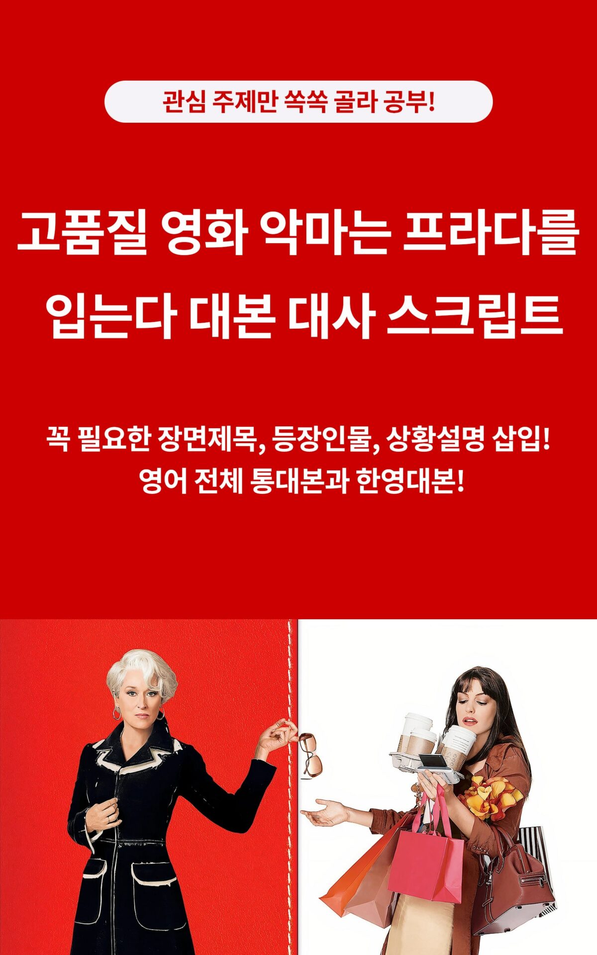 • 난이도 : 중고급 ★★★★★ • 정 가 : 전자책 19,500원 • ISBN : 979-11-94173-21-2 • 출 간 : 2025년 1월 6일 • 원작자 : Aline Brosh McKenna · Lauren Weisberger • 한국어 책 제목 : 고품질 영화 악마는 프라다를 입는다 대본 스크립트 • 영어 책 제목 : The Devil Wears Prada Script