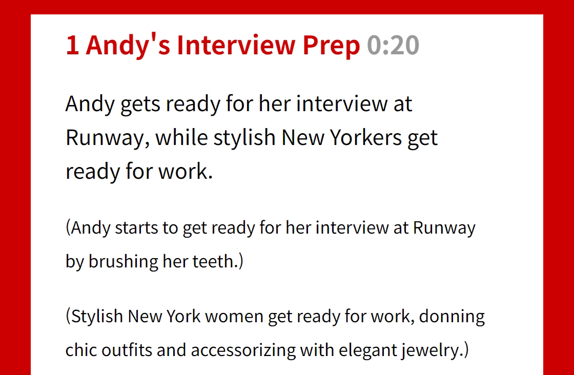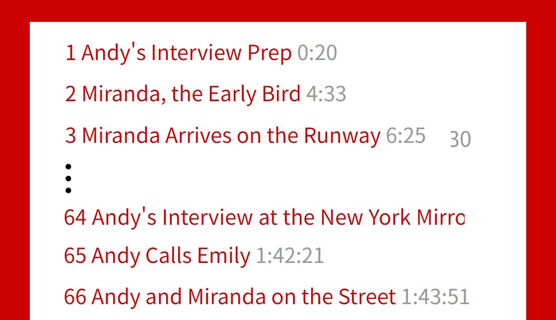 1 Andy’s Interview Prep 0:20 2 Miranda, the Early Bird 4:33 3 Miranda Arrives on the Runway 6:25 4 Andy’s Interview 7:47 5 Andy’s Interview Letdown 9:57 6 Four at the Bar 10:10 7 Andy and Nate’s Night Out 11:16 8 Early Morning at Andy’s 11:46 9 Emily’s Rule: Never Leave Your Desk 13:00 10 The Designer Shoes from Nigel 15:26 11 Andy Enters Miranda’s Room 15:42 12 Andy Doesn’t Know Demarchelier 17:00 13 Andy’s Frantic Run 18:00 14 Andy Struggles into the Office 18:38 15 Andy’s Lunch Break 19:43 16 Andy Misses Lunch 20:47 17 Miranda’s Concept Meeting 21:46 18 Andy Gets Ripped into 22:34 19 Andy and Nate’s Dinner at Home 24:24 20 Miranda and the Flying Coat 25:40 21 Office at Night 26:36 22 Andy Has Dinner with Her Dad 27:14 23 Miranda Calls During Dinner 28:39 24 Andy Gets Blasted 30:16 25 Nigel’s Advice to Andy 31:36 26 Andy and Nigel in the Dressing Room 34:40 27 Andy’s Transformation 35:30 28 Nate’s Off Work 36:27 29 Miranda: Shocked by Andy 37:03 30 Andy Joins Her Friends at the Bar 38:05 31 Andy Meets James Holt 40:15 32 Meeting Christian Thompson 41:55 33 Miranda Moves Up the Preview 43:24 34 The Office / Miranda’s Home 45:26 35 Emily Rips into Andy 48:18 36 Andy’s Frantic Run 50:21 37 Andy Gets the Harry Potter Manuscript 53:24 38 Andy Does the Twins’ Homework 54:16 39 Urban Jungle Photoshoot 56:01 40 Miranda’s Business Meeting 57:16 41 Emily’s Bad Cold 58:43 42 Andy Goes to Her Boyfriend’s Birthday Party 59:34 43 Entrance to the Charity Gala 1:00:48 44 Runway Charity Gala 1:01:58 45 Andy and Christian Thompson at the Charity Gala 1:04:04 46 Car / Home 1:05:17 47 Andy Visits Miranda’s Home 1:06:42 48 Streets / Home 1:08:30 49 Emily’s Car Crash 1:09:46 50 Emily’s Hospital 1:11:28 51 Photo Exhibit 1:12:50 52 Andy Meets Christian Thompson at the Photo Exhibit 1:13:26 53 Showdown at the Photo Exhib 1:15:21 54 Paris Business Trip 1:17:30 55 Miranda’s Parisian Suite 1:20:00 56 Andy and Nigel’s Conversation 1:23:50 57 Andy and Christian Thompson’s Dinner 1:26:04 58 A Parisian Night: Andy and Christian Thompson 1:26:55 59 Christian Thompson’s Paris Hotel Room 1:28:25 60 Andy Calls Miranda 1:30:38 61 Miranda’s Surprise Announcement 1:32:10 62 Andy and Miranda in the Car 1:35:21 63 Andy and Nate Meet at the Restaurant 1:39:28 64 Andy’s Interview at the New York Mirror 1:41:28 65 Andy Calls Emily 1:42:21 66 Andy and Miranda on the Street 1:43:51