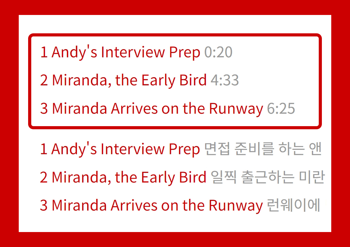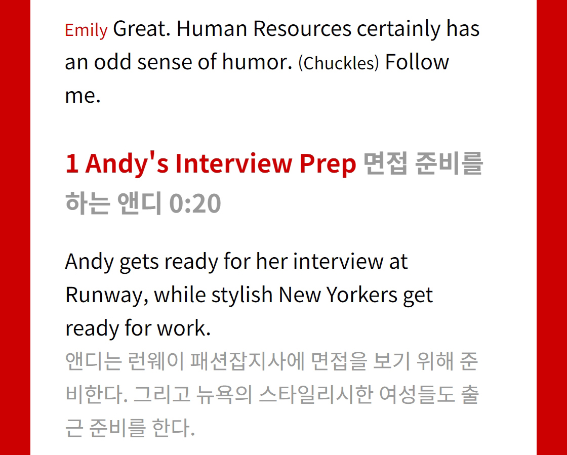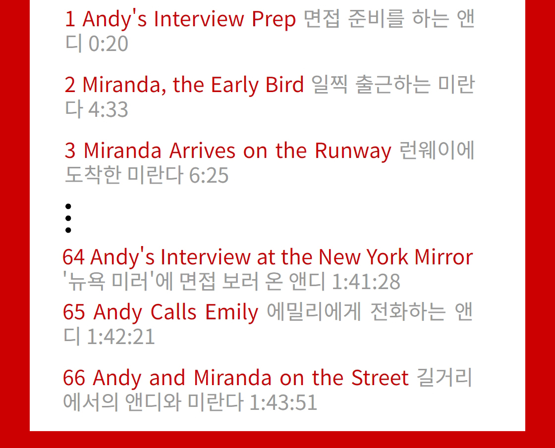 1 Andy’s Interview Prep면접 준비를 하는 앤디 0:20 2 Miranda, the Early Bird일찍 출근하는 미란다 4:33 3 Miranda Arrives on the Runway런웨이에 도착한 미란다 6:25 4 Andy’s Interview면접을 보는 앤디 7:47 5 Andy’s Interview Letdown면접에 떨어졌다고 실망하는 앤디 9:57 6 Four at the Bar바에 모인 4명 10:10 7 Andy and Nate’s Night Out밤거리를 걷는 앤디와 네이트 11:16 8 Early Morning at Andy’s앤디의 집, 이른 아침 11:46 9 Emily’s Rule: Never Leave Your Desk책상을 절대 비우지 말라는 에밀리 13:00 10 The Designer Shoes from Nigel명품 구두를 주는 나이젤 15:26 11 Andy Enters Miranda’s Room미란다방에 들어가는 앤디 15:42 12 Andy Doesn’t Know Demarchelier드마쉘리에를 모르는 앤디 17:00 13 Andy’s Frantic Run길거리를 정신없이 뛰는 앤디 18:00 14 Andy Struggles into the Office사무실에 힘들게 들어오는 앤디 18:38 15 Andy’s Lunch Break점심을 먹는 앤디 19:43 16 Andy Misses Lunch점심을 못 먹는 앤디 20:47 17 Miranda’s Concept Meeting컨셉회의를 하는 미란다 21:46 18 Andy Gets Ripped into엄청나게 혼나는 앤디 22:34 19 Andy and Nate’s Dinner at Home네이트와 집에서 저녁 먹는 앤디 24:24 20 Miranda and the Flying Coat백과 코트를 계속 던지는 미란다 25:40 21 Office at Night밤이 된 사무실 26:36 22 Andy Has Dinner with Her Dad아빠와 함께 저녁식사를 하는 앤디 27:14 23 Miranda Calls During Dinner저녁식사 도중에 걸려온 미란다의 전화 28:39 24 Andy Gets Blasted아주 심하게 욕을 먹는 앤디 30:16 25 Nigel’s Advice to Andy앤디에게 충고하는 나이젤 31:36 26 Andy and Nigel in the Dressing Room드레스룸에 간 앤디와 나이젤 34:40 27 Andy’s Transformation화려하게 변신한 앤디 35:30 28 Nate’s Off Work퇴근하는 네이트 36:27 29 Miranda: Shocked by Andy앤디의 변신에 놀란 미란다 37:03 30 Andy Joins Her Friends at the Bar친구들이 모인 바에 간 앤디 38:05 31 Andy Meets James Holt제임스 홀트를 만나는 앤디 40:15 32 Meeting Christian Thompson크리스찬 톰슨과의 만남 41:55 33 Miranda Moves Up the Preview프리뷰 시간을 앞당기는 미란다 43:24 34 The Office / Miranda’s Home사무실과 미란다의 집 45:26 35 Emily Rips into Andy에밀리에게 엄청 혼나는 앤디 48:18 36 Andy’s Frantic Run길거리를 정신없이 뛰는 앤디 50:21 37 Andy Gets the Harry Potter Manuscript해리포터 원고를 구한 앤디 53:24 38 Andy Does the Twins’ Homework쌍둥이의 숙제를 하는 앤디 54:16 39 Urban Jungle Photoshoot도시의 정글 화보 촬영장 56:01 40 Miranda’s Business Meeting업무회의를 하는 미란다 57:16 41 Emily’s Bad Cold감기가 심하게 걸린 에밀리 58:43 42 Andy Goes to Her Boyfriend’s Birthday Party남자친구 생일파티에 가려는 앤디 59:34 43 Entrance to the Charity Gala자선 파티장 입구 1:00:48 44 Runway Charity Gala런웨이 자선 파티 1:01:58 45 Andy and Christian Thompson at the Charity Gala자선파티장에서 만난 앤디와 크리스찬 톰슨 1:04:04 46 Car / Home차와 집 1:05:17 47 Andy Visits Miranda’s Home미란다의 집에 방문한 앤디 1:06:42 48 Streets / Home밤거리 / 집 1:08:30 49 Emily’s Car Crash차 사고를 당하는 에밀리 1:09:46 50 Emily’s Hospital에밀리가 입원한 병원 1:11:28 51 Photo Exhibit사진 전시회 1:12:50 52 Andy Meets Christian Thompson at the Photo Exhibit사진 전시회에서 크리스찬 톰슨을 만난 앤디 1:13:26 53 Showdown at the Photo Exhib사진 전시회에서 네이트와 싸우는 앤디 1:15:21 54 Paris Business Trip파리 출장 1:17:30 55 Miranda’s Parisian Suite미란다의 파리 호텔방 1:20:00 56 Andy and Nigel’s Conversation앤디와 나이젤의 대화 1:23:50 57 Andy and Christian Thompson’s Dinner앤디와 크리스찬 톰슨과의 저녁식사 1:26:04 58 A Parisian Night: Andy and Christian Thompson앤디와 크리스찬 톰슨의 파리의 밤 1:26:55 59 Christian Thompson’s Paris Hotel Room크리스찬 톰슨의 파리 호텔방 1:28:25 60 Andy Calls Miranda미란다에게 전화하는 앤디 1:30:38 61 Miranda’s Surprise Announcement깜짝 발표를 하는 미란다 1:32:10 62 Andy and Miranda in the Car차 안에 함께 있는 앤디와 미란다 1:35:21 63 Andy and Nate Meet at the Restaurant식당에서 만난 앤디와 네이트 1:39:28 64 Andy’s Interview at the New York Mirror‘뉴욕 미러’에 면접 보러 온 앤디 1:41:28 65 Andy Calls Emily에밀리에게 전화하는 앤디 1:42:21 66 Andy and Miranda on the Street길거리에서의 앤디와 미란다 1:43:51