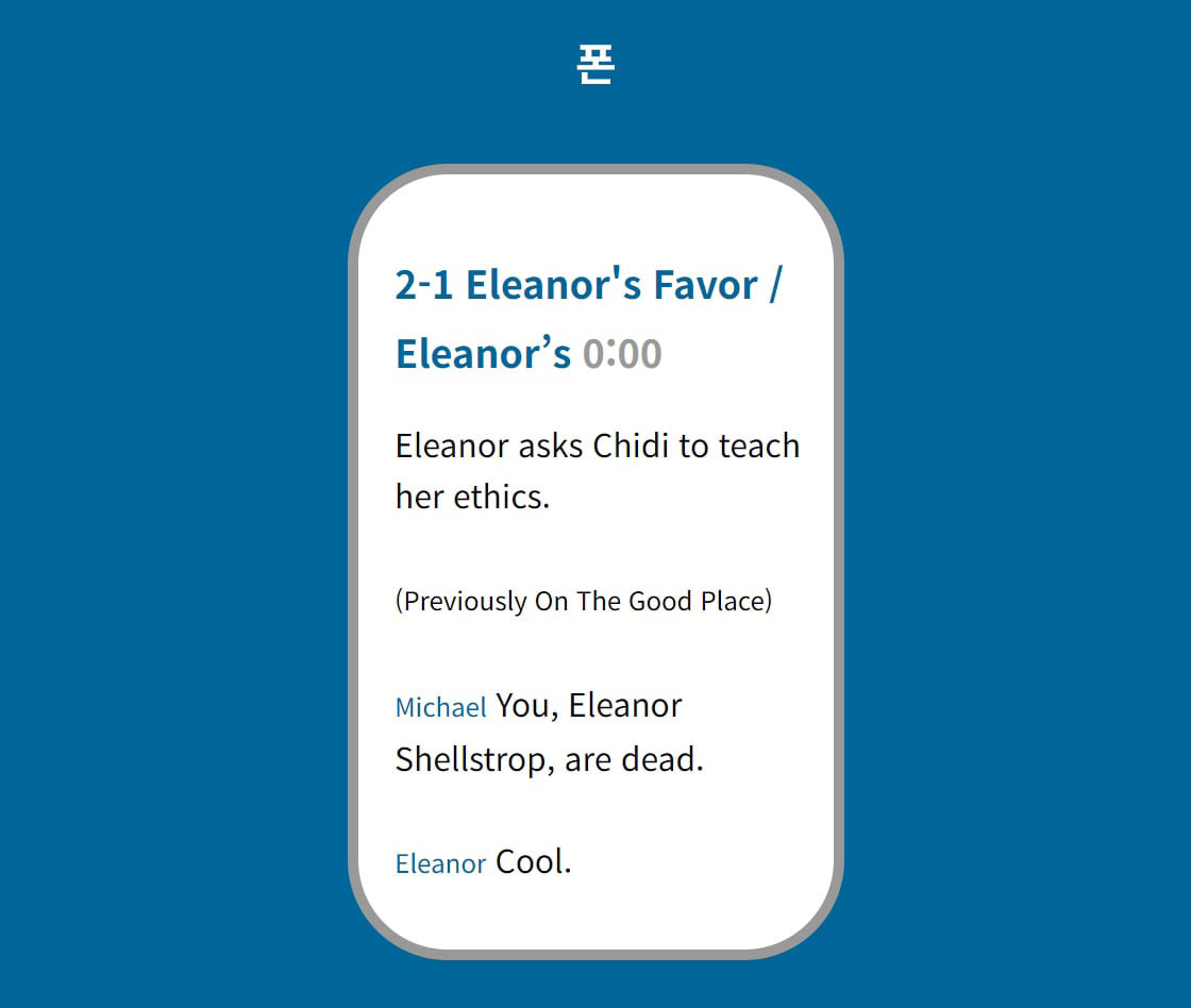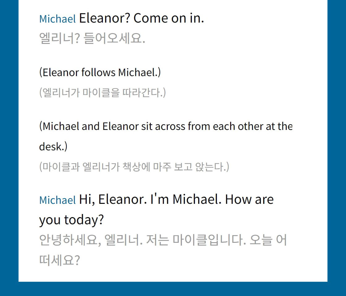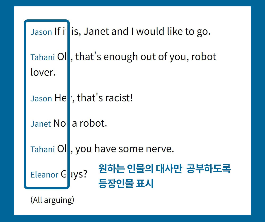 미드 굿 플레이스 시즌1 대본! 천국(굿 플레이스)에 잘못 들어간 주인공 엘리너가 착한 사람이 되기 위해 노력하는 코미디! 철학적인 주제를 다루면서도 일상적인 대화가 많아 수준 높은 어휘와 자연스러운 표현을 함께 배울 수 있음.